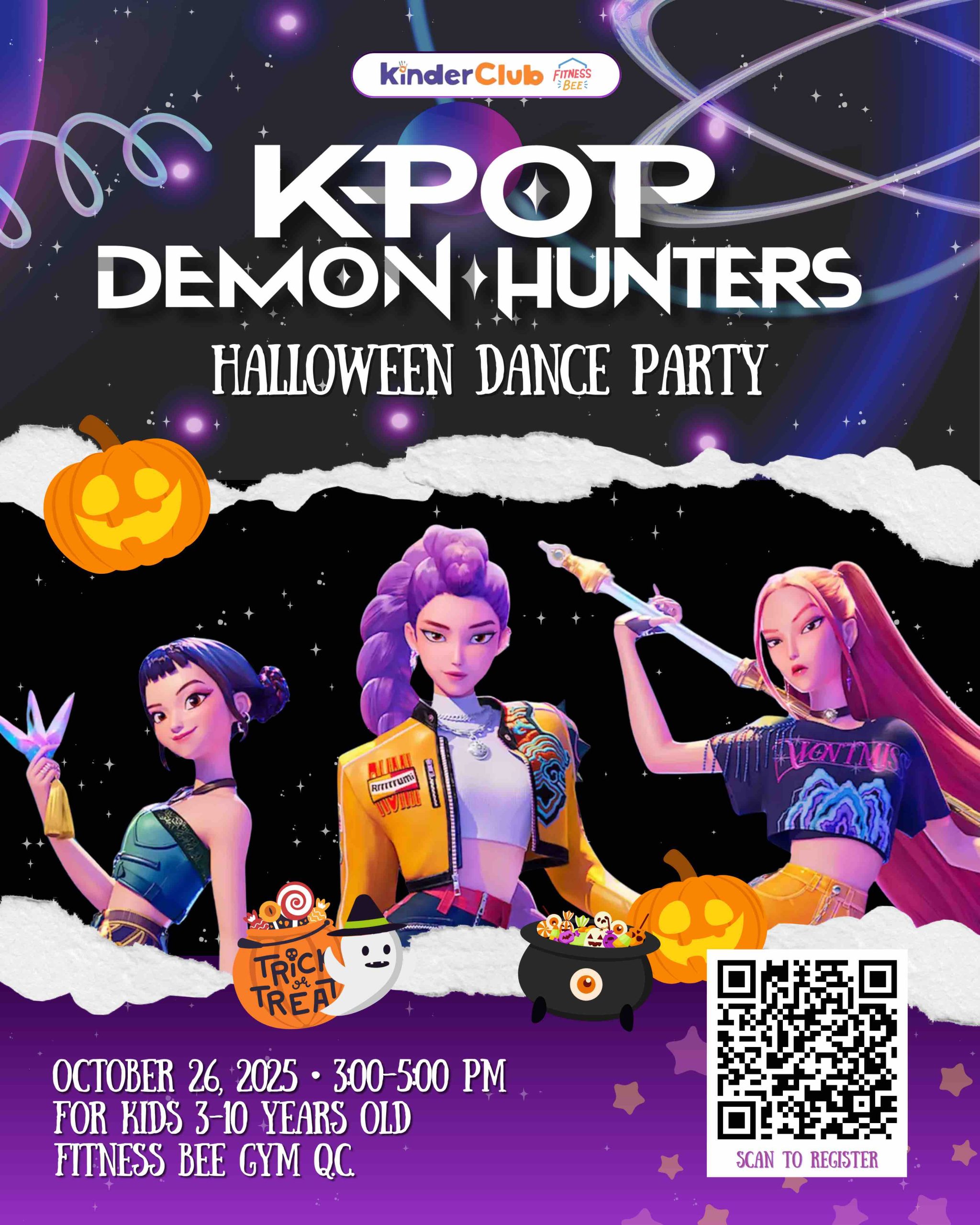 Dress up and let’s have a dance party with your favorite Kpop Demon Hunters songs on OCTOBER 26th, Sunday 3pm! Learn choregraphed steps with a professional dance coach, visit different creative booths and let’s go TRICK or TREATING together! See you in Fitness Bee for this year’s Halloween playdate!